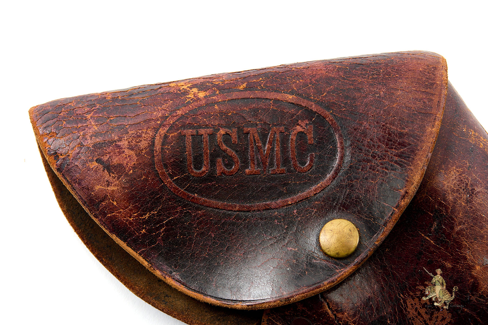 Product Description: A well-preserved example of early 20th-century U.S. military sidearm accoutrement, this USMC Marine Corps M1905 leather holster remains structurally sound and presents well overall despite expected age-related wear. The surface exhibits light crazing and areas of color loss consistent with service use and long-term storage.