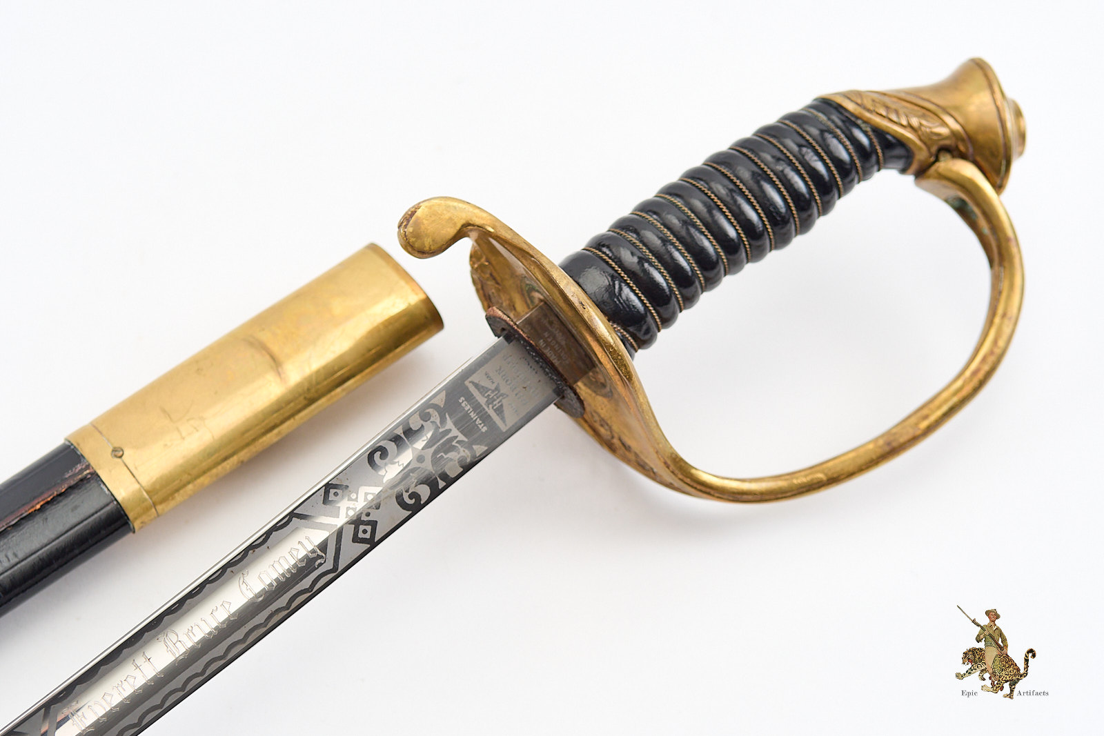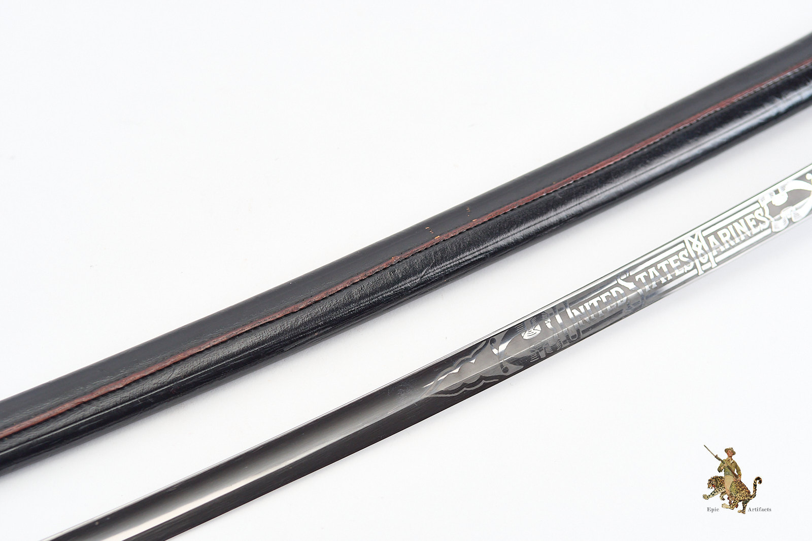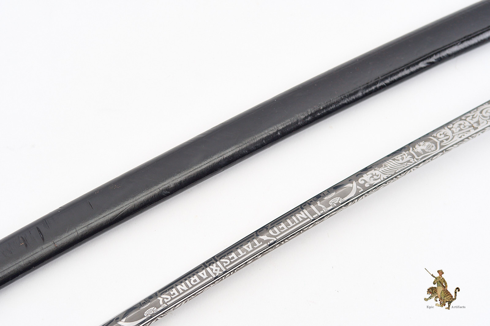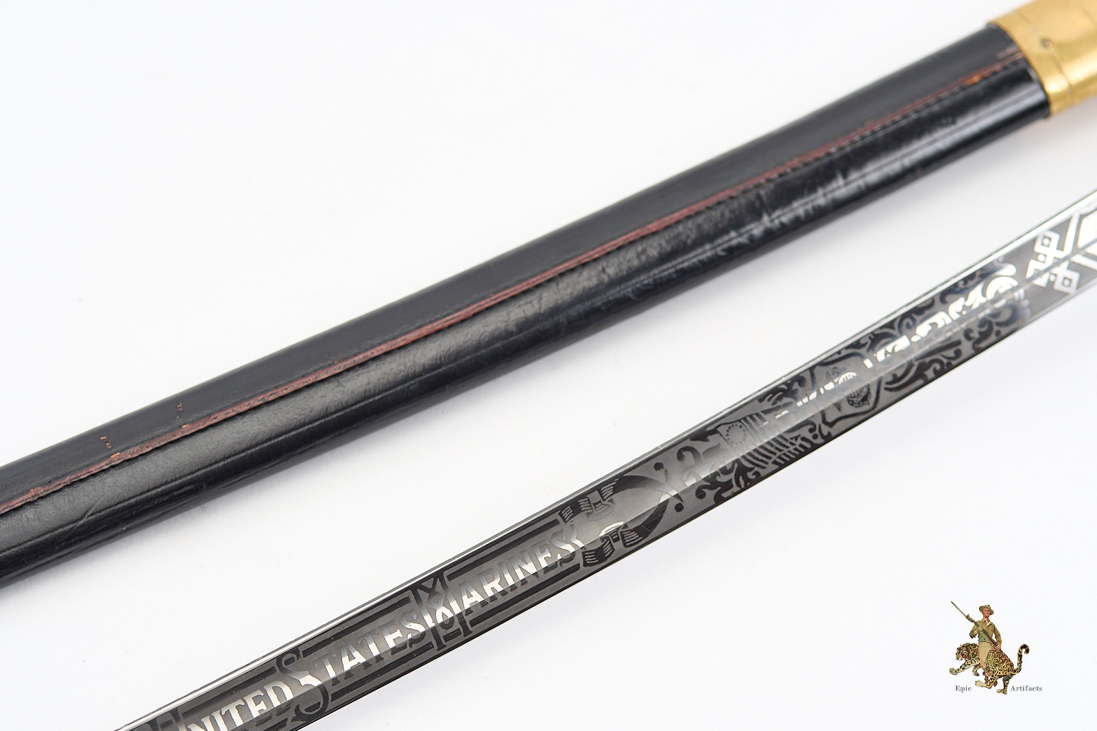 Measuring 33¾ inches at the blade and 39¼ inches overall, the sword is accompanied by its original black leather scabbard, which survives in excellent condition with only minimal wear. Brass elements show light, even patina from handling and time. A refined and increasingly scarce example of its pattern, this Vietnam Era USMC NCO Sword – H&H – Etched Name offers both historical interest and strong visual presence, making it a desirable acquisition for advanced militaria collectors.
