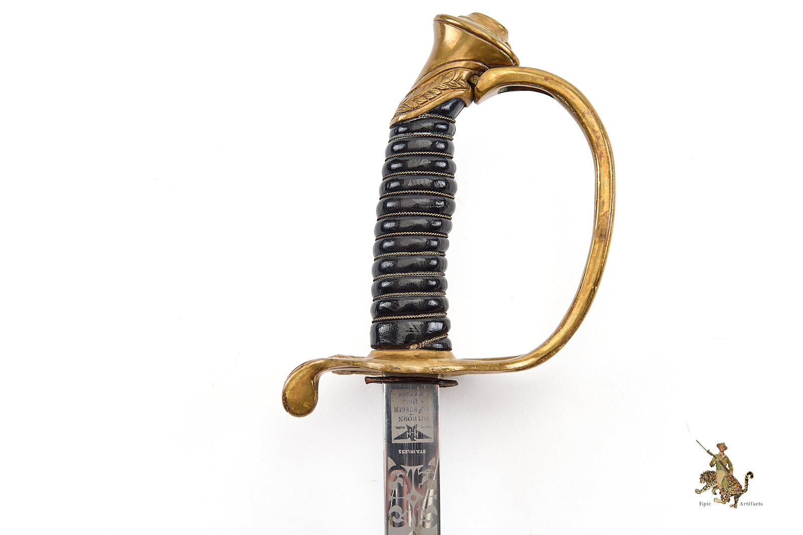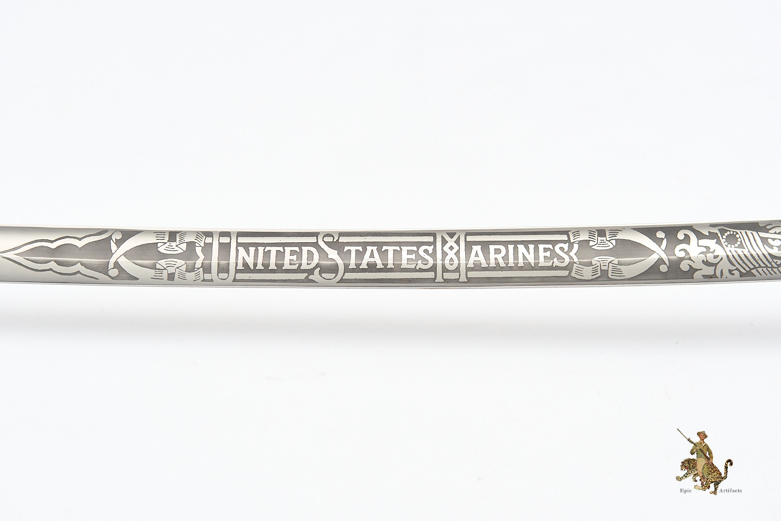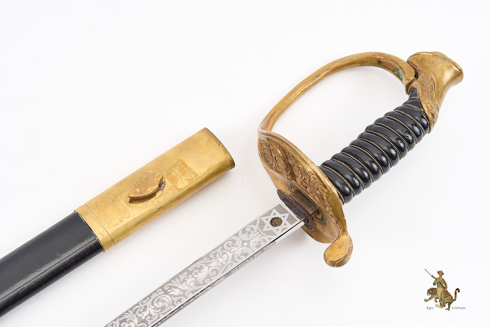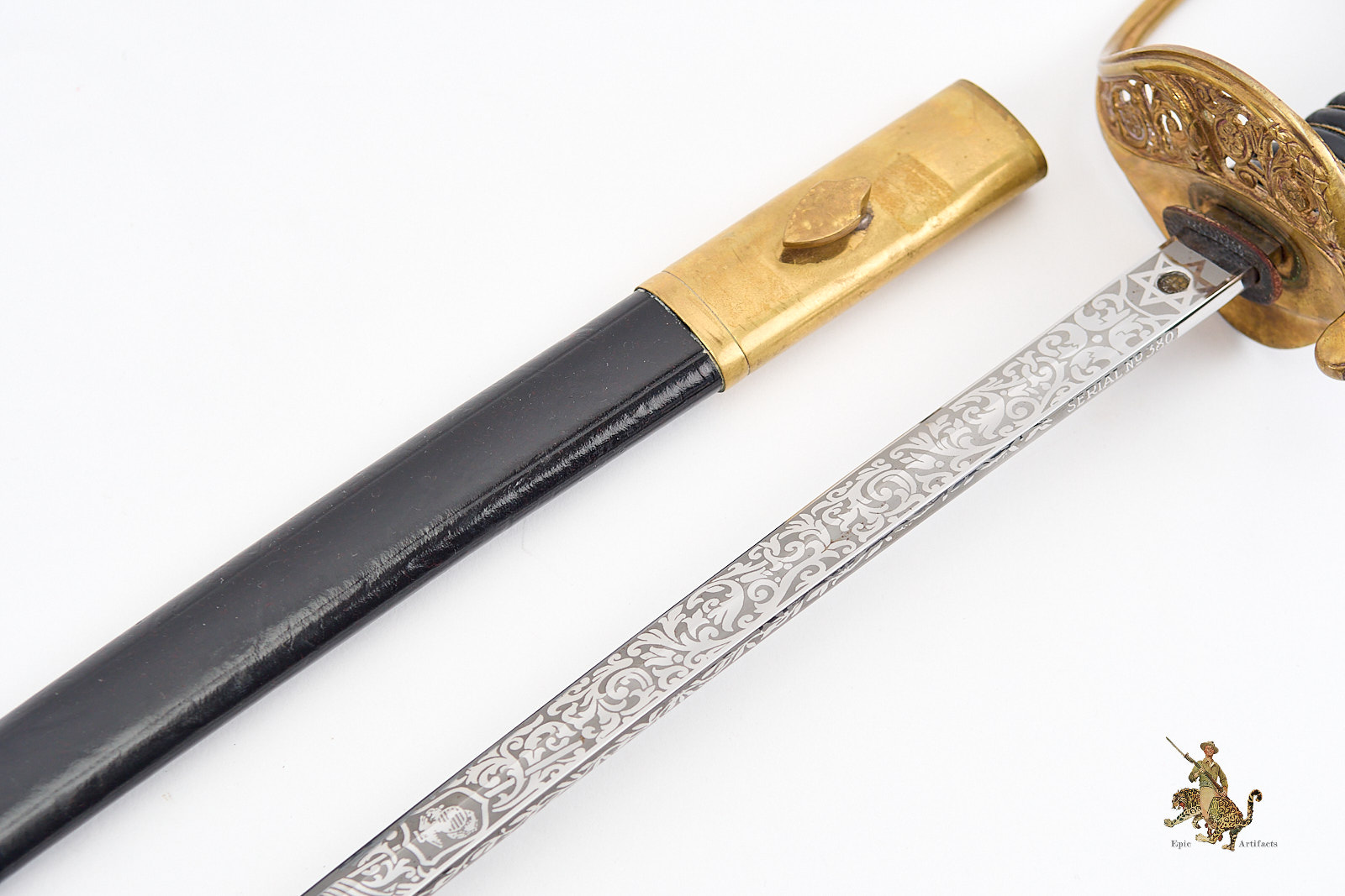 Measuring 33¾ inches at the blade and 39¼ inches overall, the sword is accompanied by its original black leather scabbard, which survives in excellent condition with only minimal wear. Brass elements show light, even patina from handling and time. A refined and increasingly scarce example of its pattern, this Vietnam Era USMC NCO Sword – H&H – Etched Name offers both historical interest and strong visual presence, making it a desirable acquisition for advanced militaria collectors.