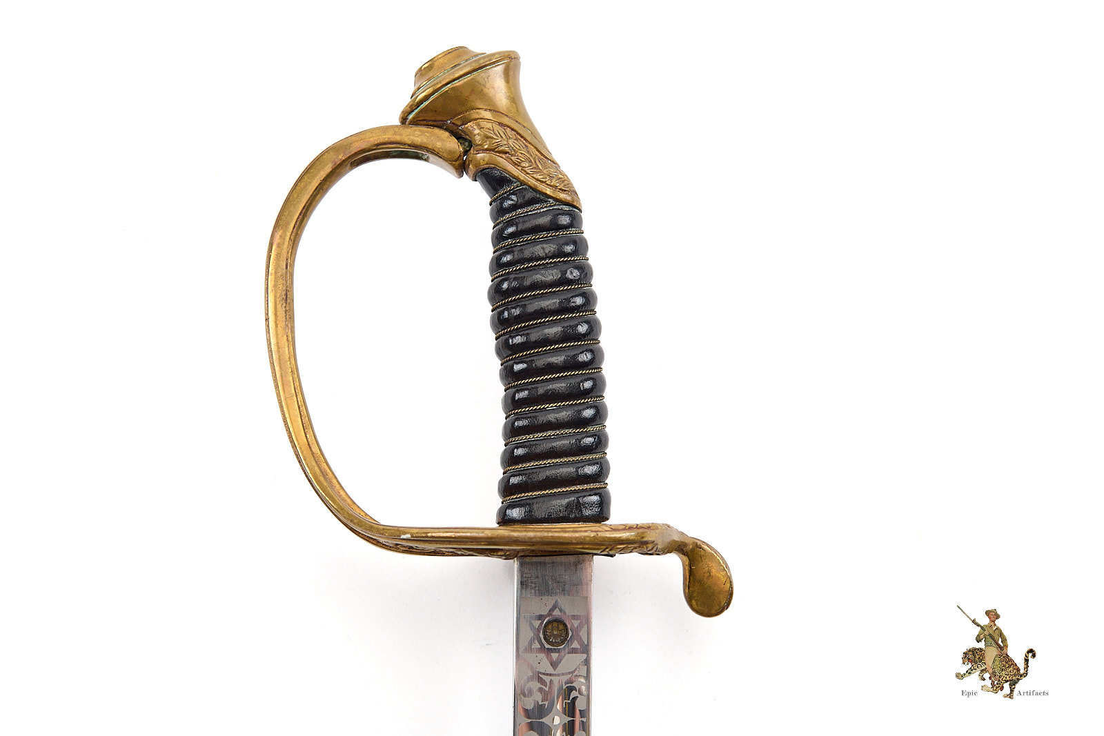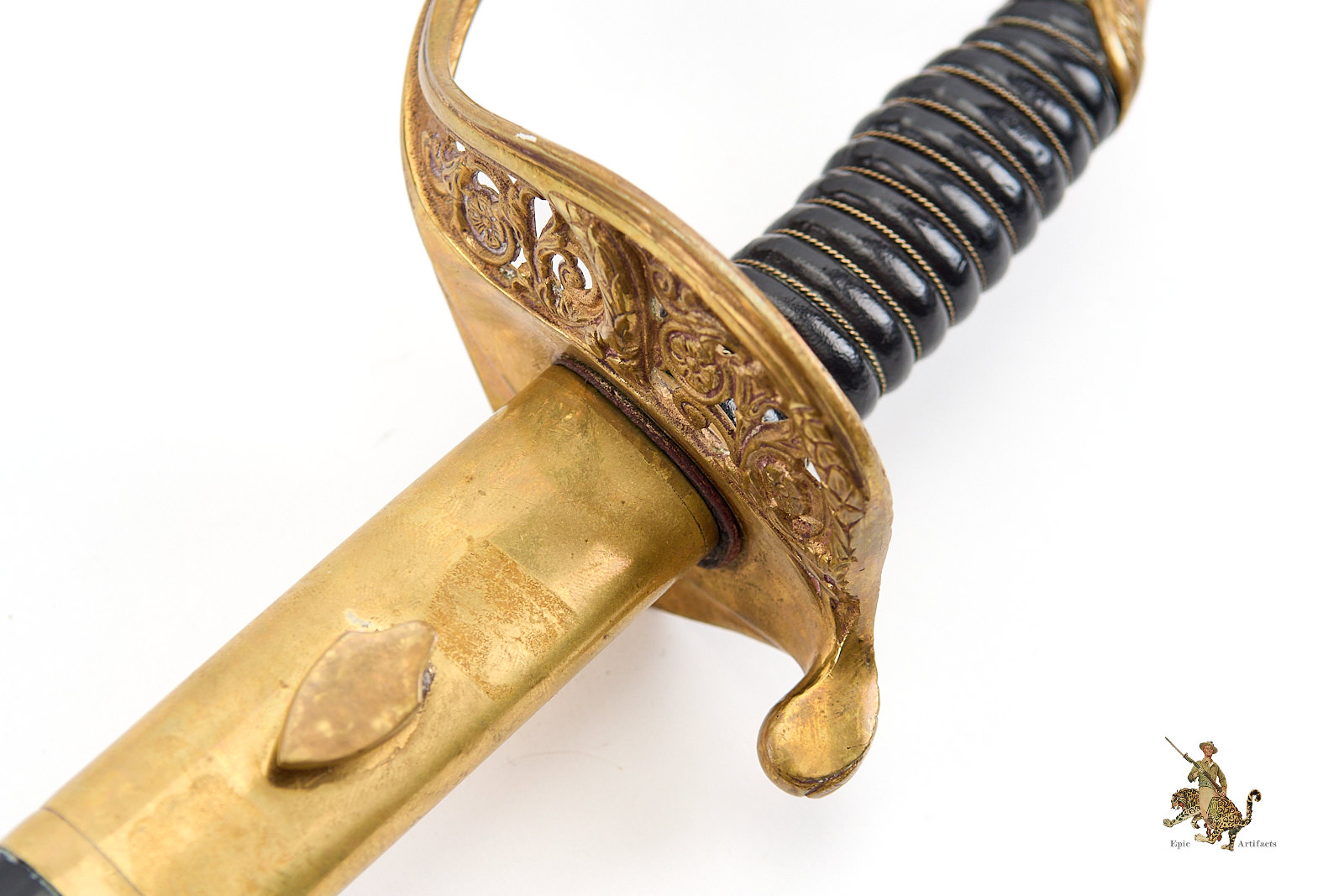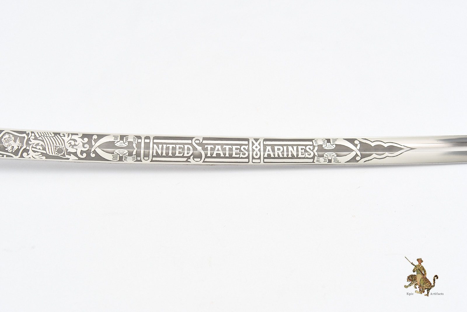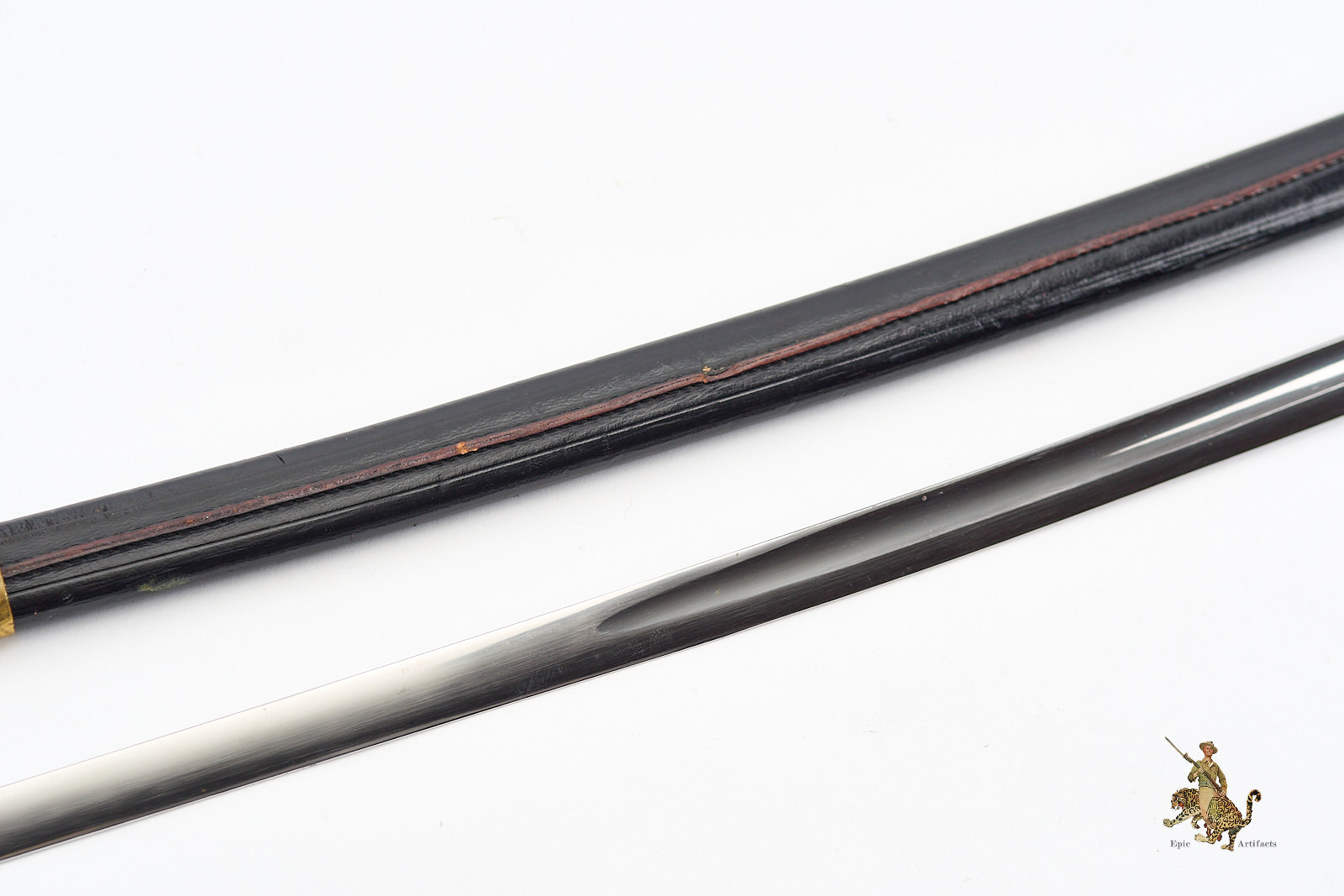 Measuring 33¾ inches at the blade and 39¼ inches overall, the sword is accompanied by its original black leather scabbard, which survives in excellent condition with only minimal wear. Brass elements show light, even patina from handling and time. A refined and increasingly scarce example of its pattern, this Vietnam Era USMC NCO Sword – H&H – Etched Name offers both historical interest and strong visual presence, making it a desirable acquisition for advanced militaria collectors.