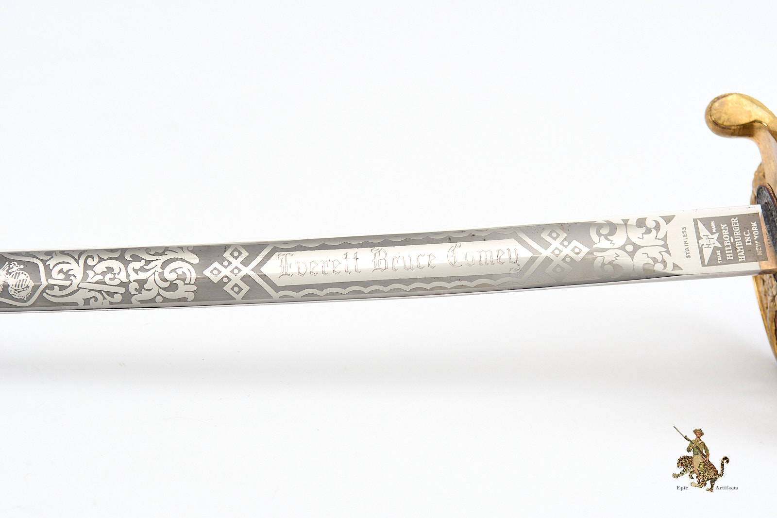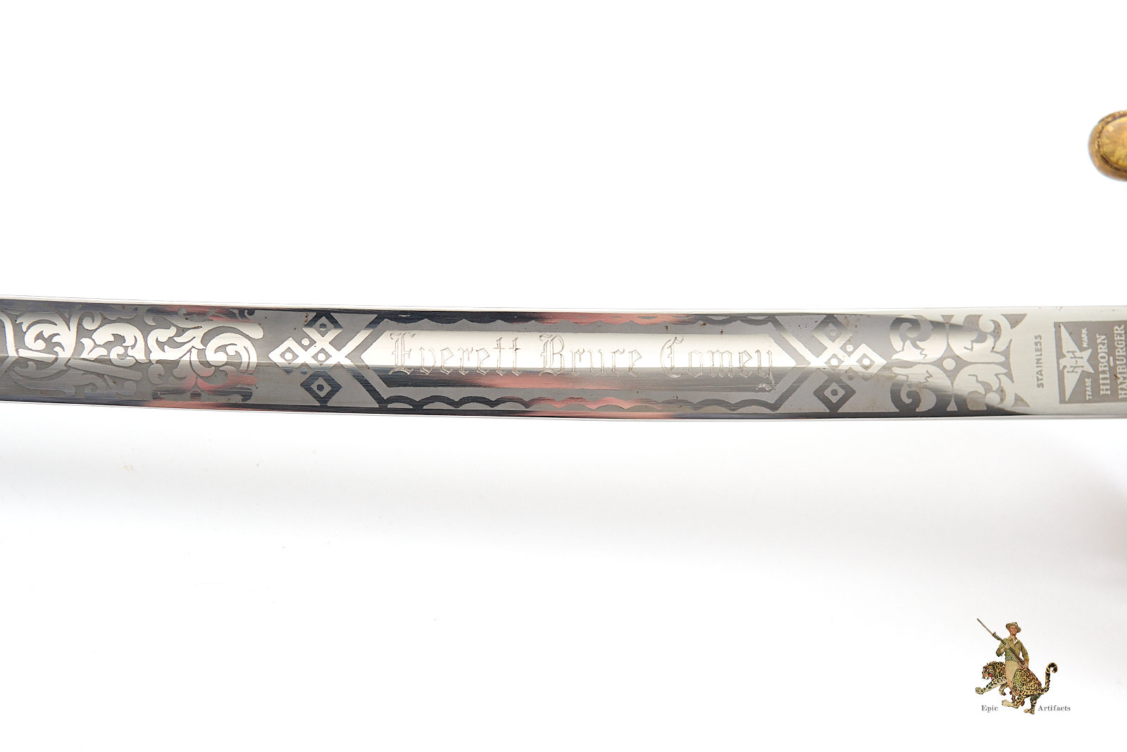 Product Description: A Vietnam Era USMC NCO Sword – H&H – Etched Name, produced by Hilborn Hamburger Inc. of Solingen, presented here in notably high condition. The blade retains its full chrome finish and crisp factory etching, including the personalized inscription Everett Bruce Comey. The spine is stamped with serial number 380, and the hilt components—including the guard and wire-wrapped grip—remain exceptionally clean, with the original twisted wire firmly set. A slight movement is detectable at the pommel and grip, consistent with age but not detracting from display quality.