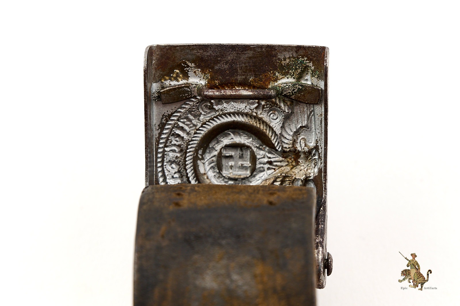 The leather belt measures approximately 38 inches and remains in excellent condition, though it is unmarked. Its age and wear match the buckle perfectly, leaving little doubt that the two have been together since the period. The overall presentation is that of an untouched, honest set with exactly the kind of combat-worn character collectors prize.