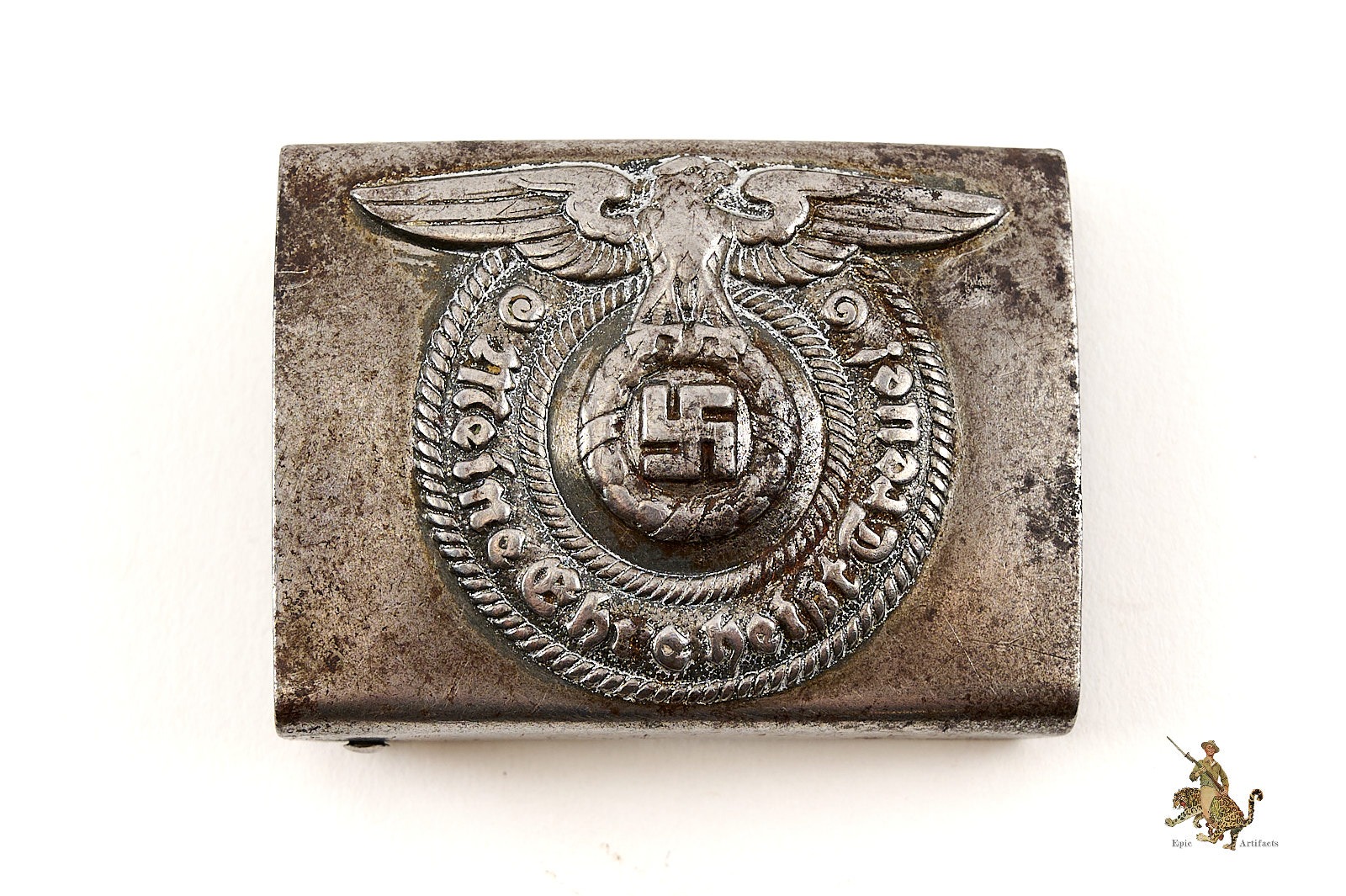 The steel buckle is an unmarked factory product of Overhoff & Cie., the most prolific and recognized maker of SS belt buckles. In 1944–1945 production, these buckles were typically left unmarked, as seen here. The obverse shows significant period wear, with much of the original paint worn away from service use, leaving an authentic combat patina. Despite this, the eagle and the “Meine Ehre heißt Treue” motto remain exceptionally crisp, reflecting the high-quality die work associated with Overhoff.