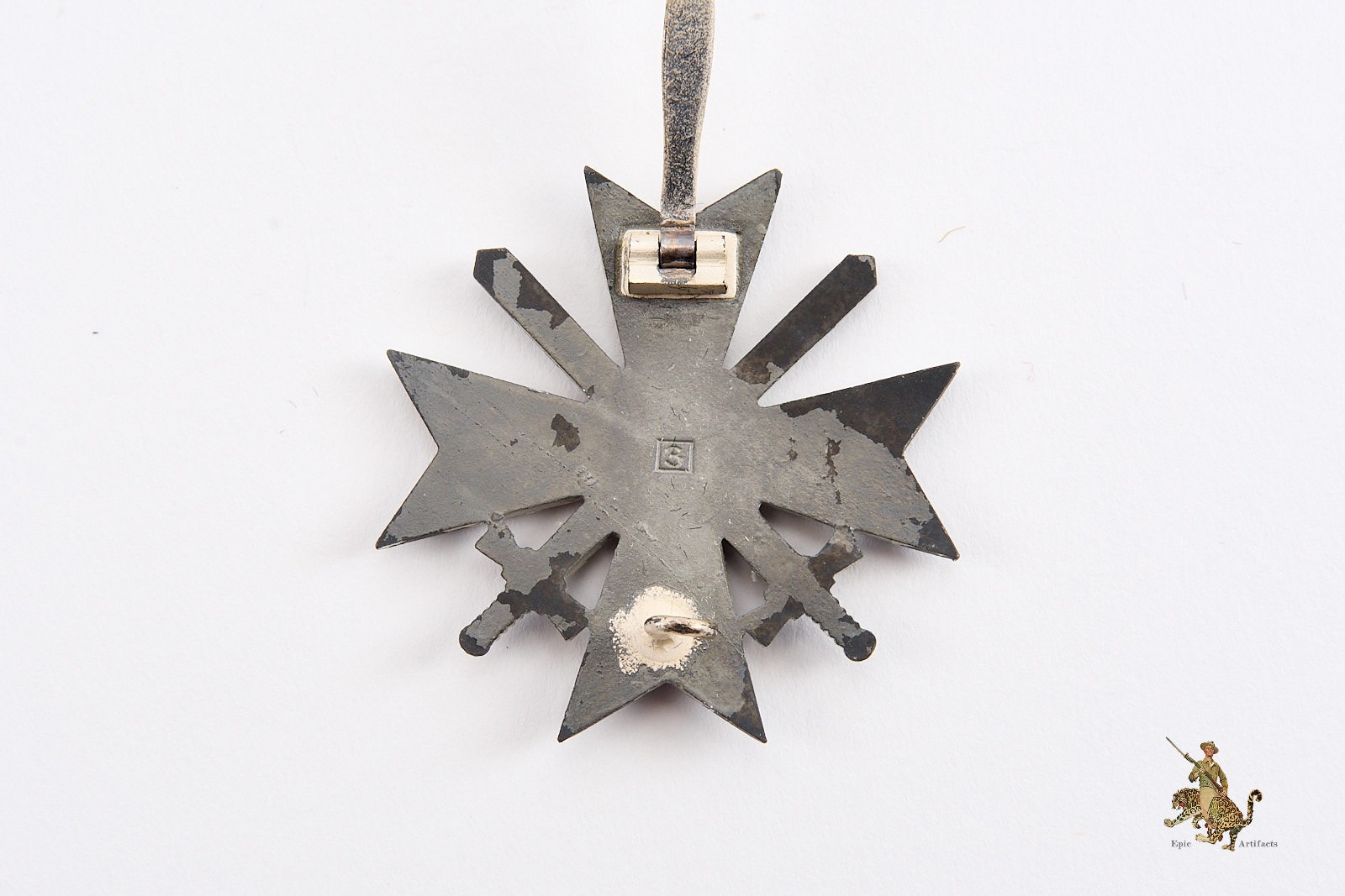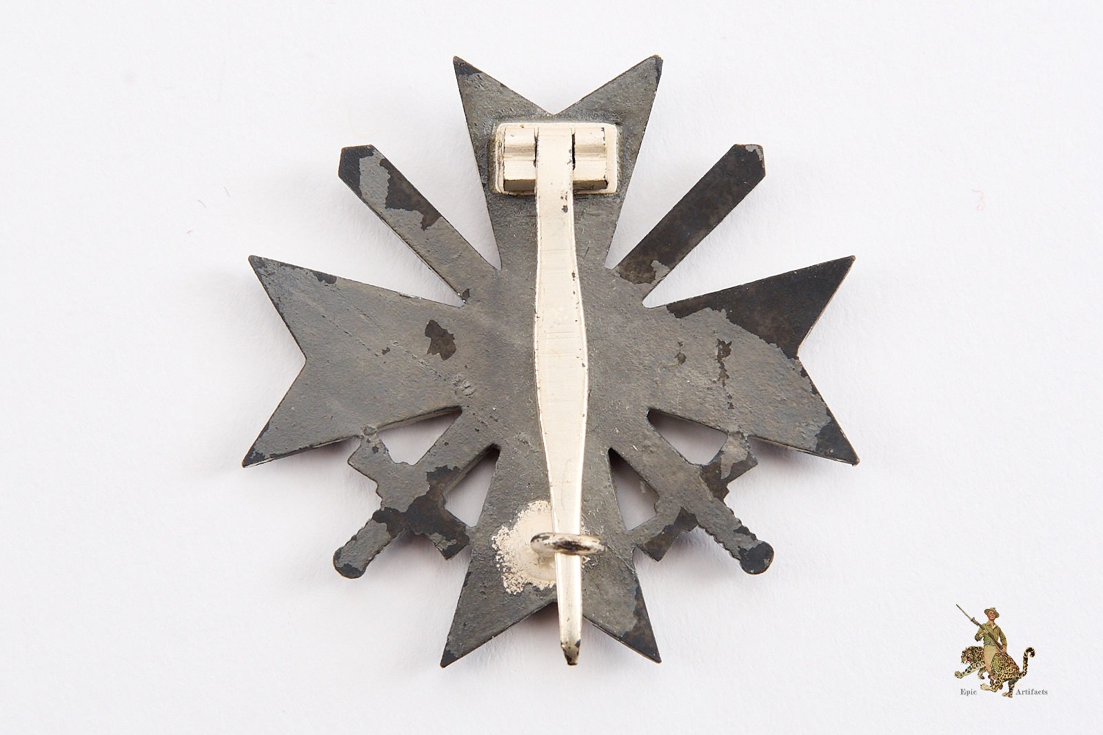 Historical Description: The War Merit Cross (Kriegsverdienstkreuz) was likely the most commonly awarded WWII German decoration. In 1939, when Hitler reinstituted the Iron Cross, he did not reinstitute the non-combatant version that had existed in previous wars. As a successor to this, he created the War Merit Cross. It existed in the same grades as the Iron Cross- there was the War Merit Cross 1st Class, War Merit Cross 2nd Class, and Knights Cross of the War Merit Cross. The 2nd Class award was a medal suspended from a ribbon, coated with a bronze finish. The War Merit Cross 1st Class was a pin-on award, with a silver finish. The Knights Cross version was worn on a ribbon around the bearer’s neck. The crosses were further differentiated into two categories: with swords, and without swords. The award with swords was for meritorious service in the face of the enemy and could be awarded to soldiers to recognize achievements, that did not merit award of an Iron Cross, as well as to civilians who fought fires during Allied air raids. The award without swords was for furthering the war effort and could also be awarded to soldiers or civilians. Millions of people were eligible for these crosses, from members of the armed services to personnel of the Reichsbahn, the Luftschutz, border guards and customs agents and members of the other various political and paramilitary Third Reich organizations, and even factory workers. Some soldiers used a sort of military humor to mock the War Merit Cross as a “far-from-combat badge” or “field kitchen assault badge.” But many recipients of these crosses wore them with pride.