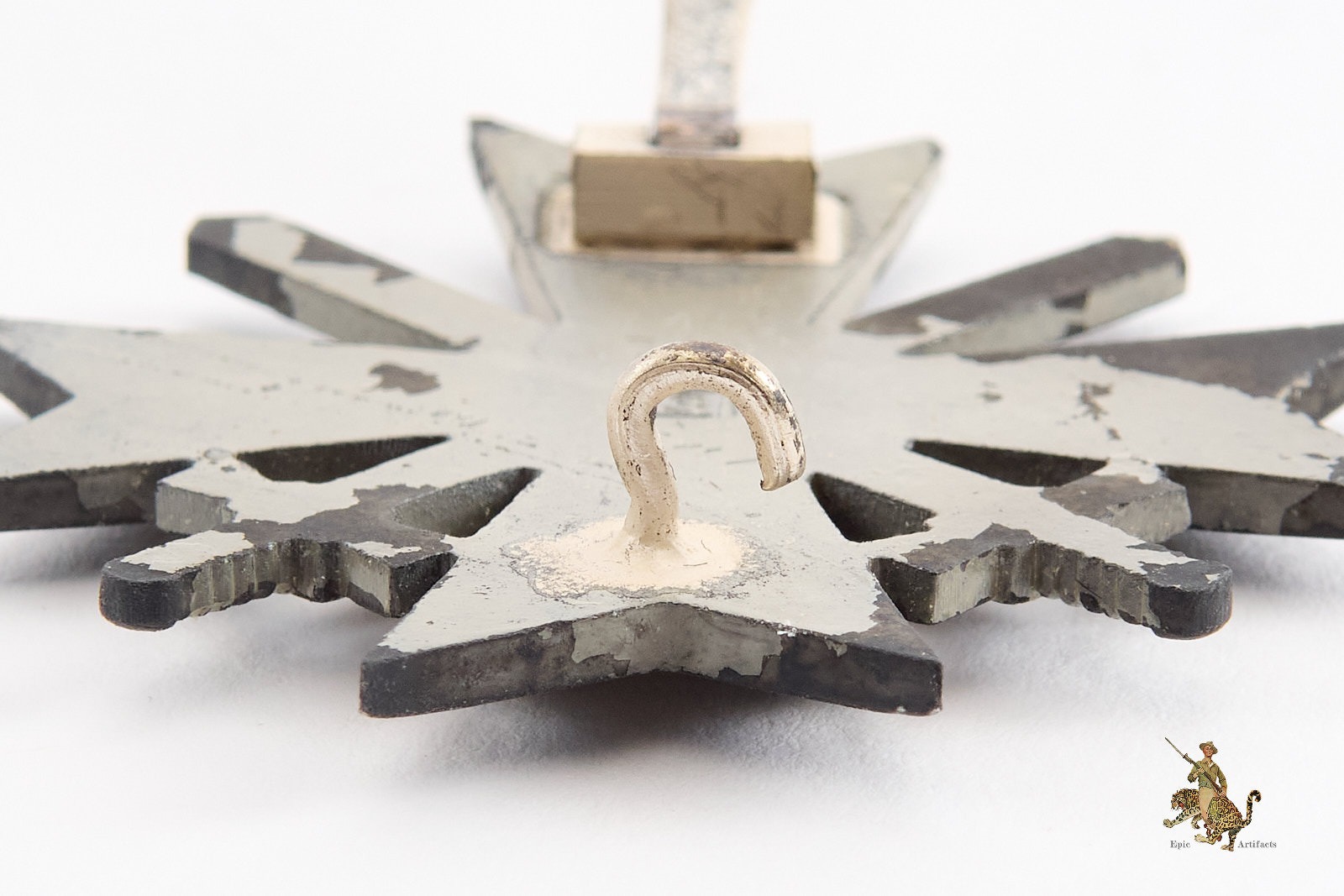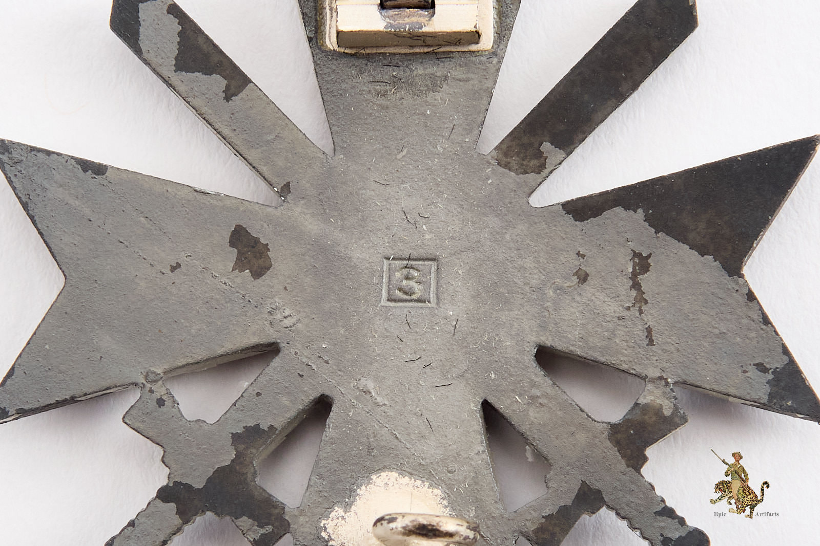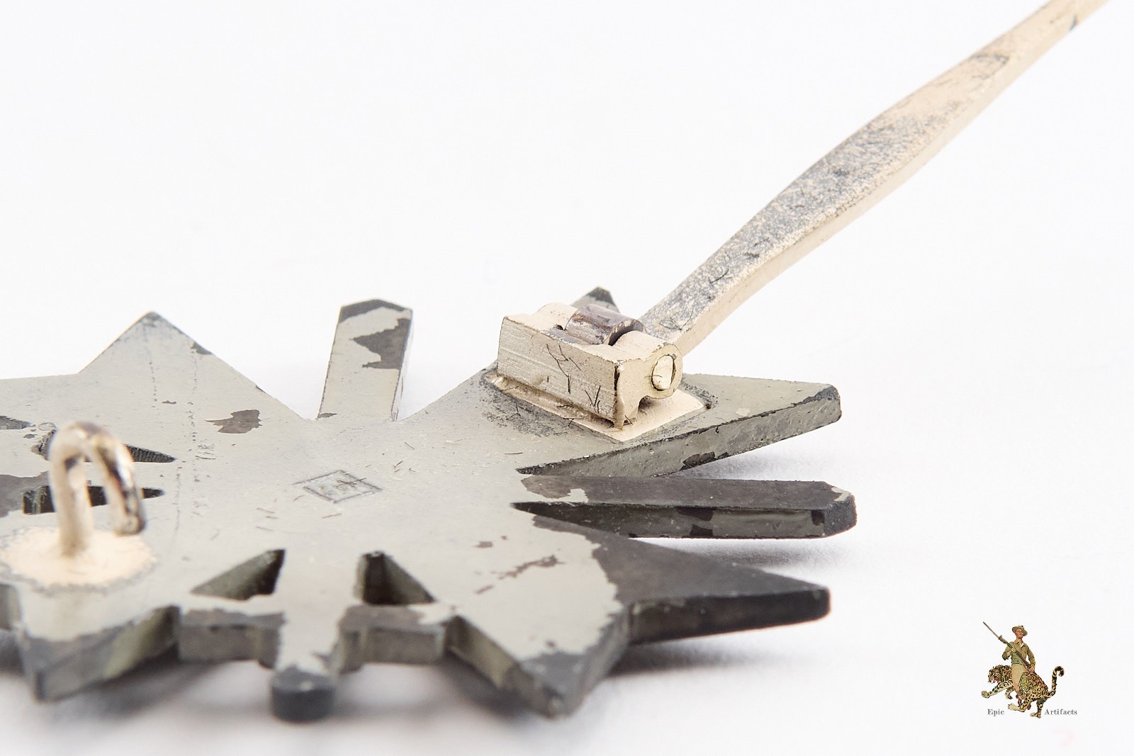 Product Description: This War Merit Cross 1st Class with Swords “3” – Deumer is a very handsome badge. The award is struck from fine zinc, and retains minimal amount of original silver finish. The obverse of the cross shows nice patina with partial silver finish. The reverse of this cross is flat and smooth, with minimal finish still attached. The hardware setup is functional and all original with soldered block hinge and round wire metal catch. The badge is maker marked with the PKZ code number “3” indicating manufacture by the prestigious firm of Deumer. This is a great example of a War Merit Cross 1st Class, in excellent condition.