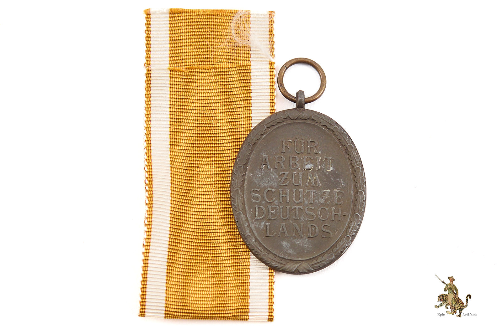 Historical Description: The Western Front Medal, officially known as the West Wall Medal (Deutsches Schutzwall-Ehrenzeichen), was instituted by Adolf Hitler on 2 August 1939 to honor those who helped construct or serve along Germany’s western fortifications, the Westwall or Siegfried Line. The medal’s design, by Richard Klein, depicted an eagle clutching a swastika above a crossed sword and spade—symbols of the cooperation between soldiers and workers in preparing the nation’s defenses. Over 620,000 medals were awarded during the early war years to engineers, soldiers, and laborers involved in the project.
