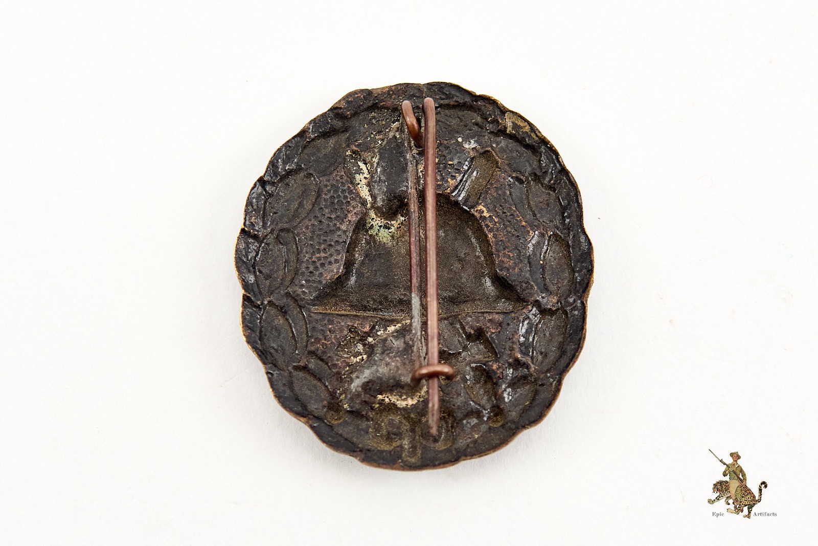 Product Description: This WW1 Black Wound Badge is a nice example, in excellent condition. It is made of stamped tombak. The obverse retains most of the original, factory applied, slightly black enamel paint finish, with a pleasant patina and wear to the high points showing the tombak underneath. All of the original detail is present. The reverse is hollow, as is typical for these stamped black grade badges. The hardware is a single round wire spring pin and catch. A bit of old dust on the reverse gives the badge a nice, untouched look. There is no maker marking. Overall, the condition of this WW1 Black Wound Badge rates as excellent.