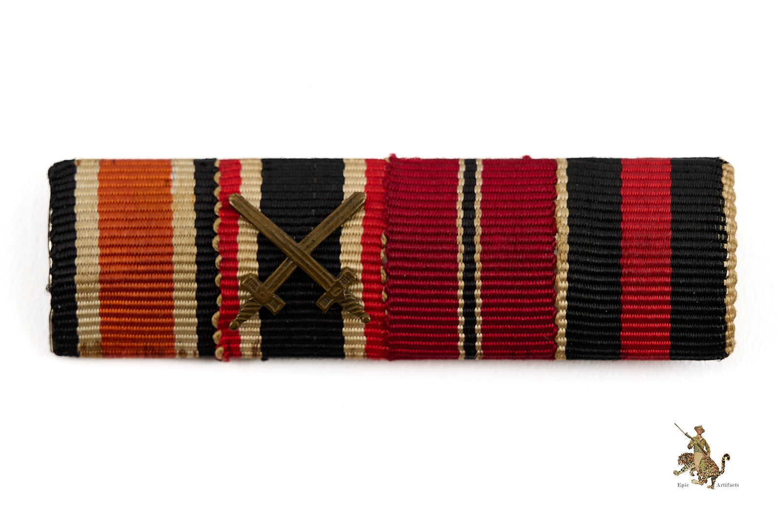 Product Description: This Four Place Ribbon Bar is an attractive and historically representative Third Reich–era award grouping, featuring a desirable combination of period ribbons. From left to right, the ribbon bar displays the Iron Cross, War Merit Cross with Swords, Eastern Front Medal, and Czech Annexation Medal.