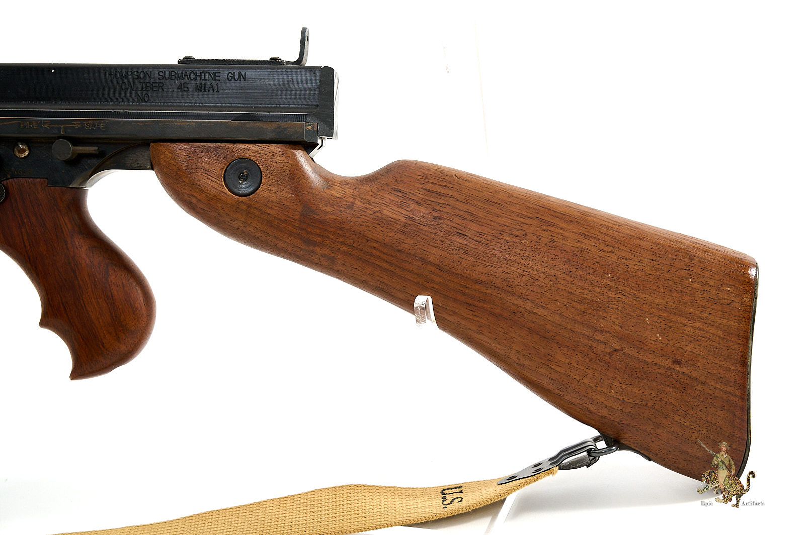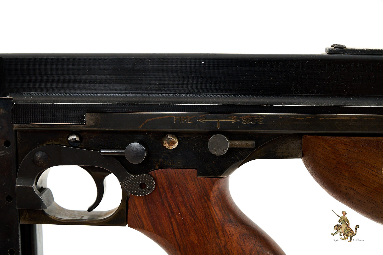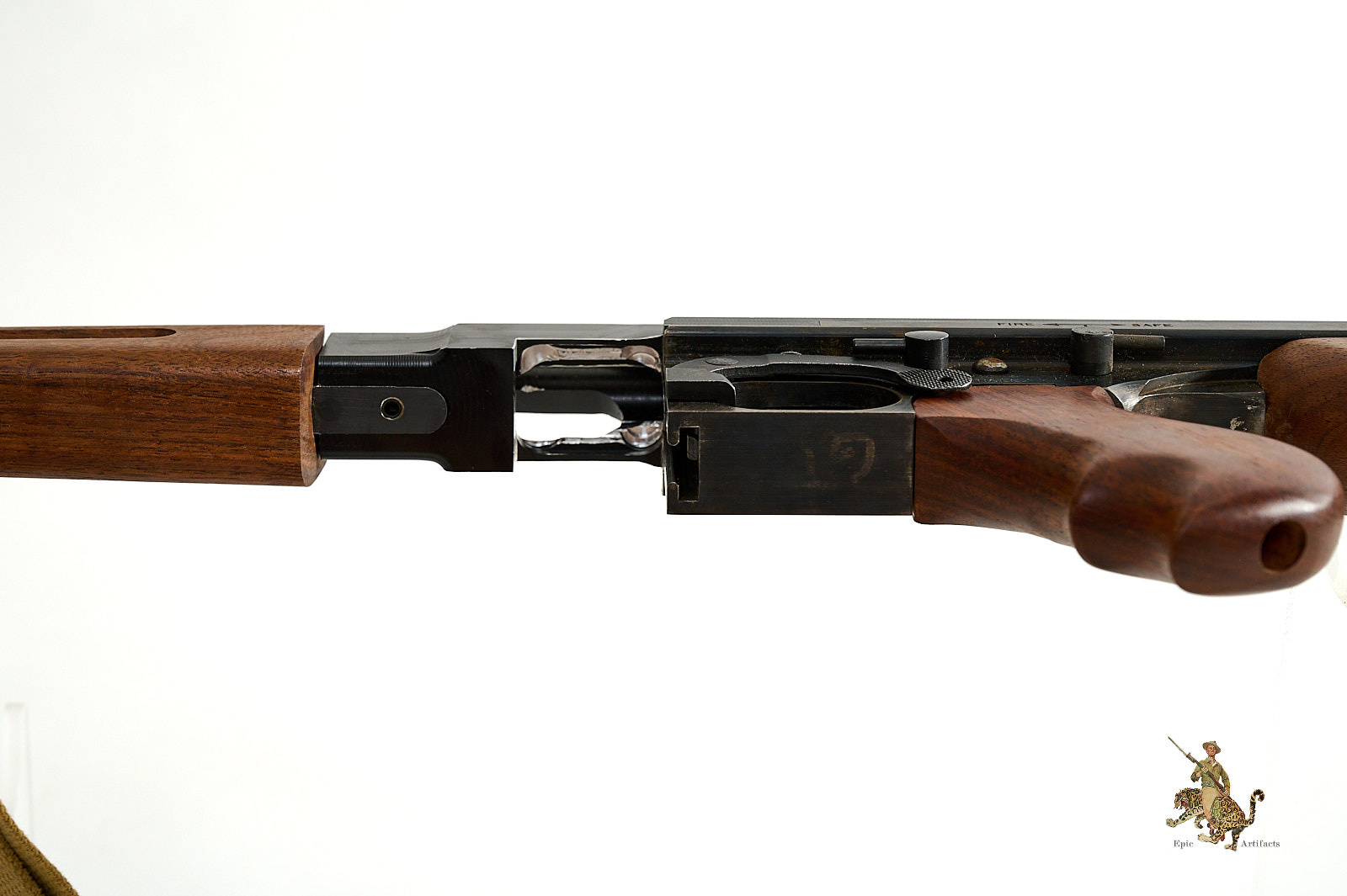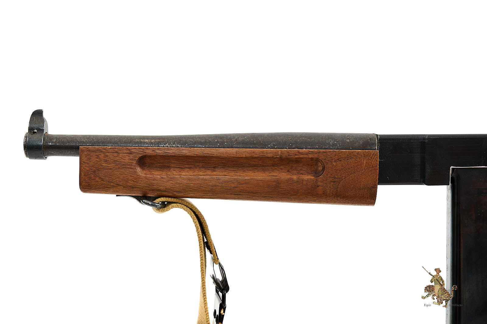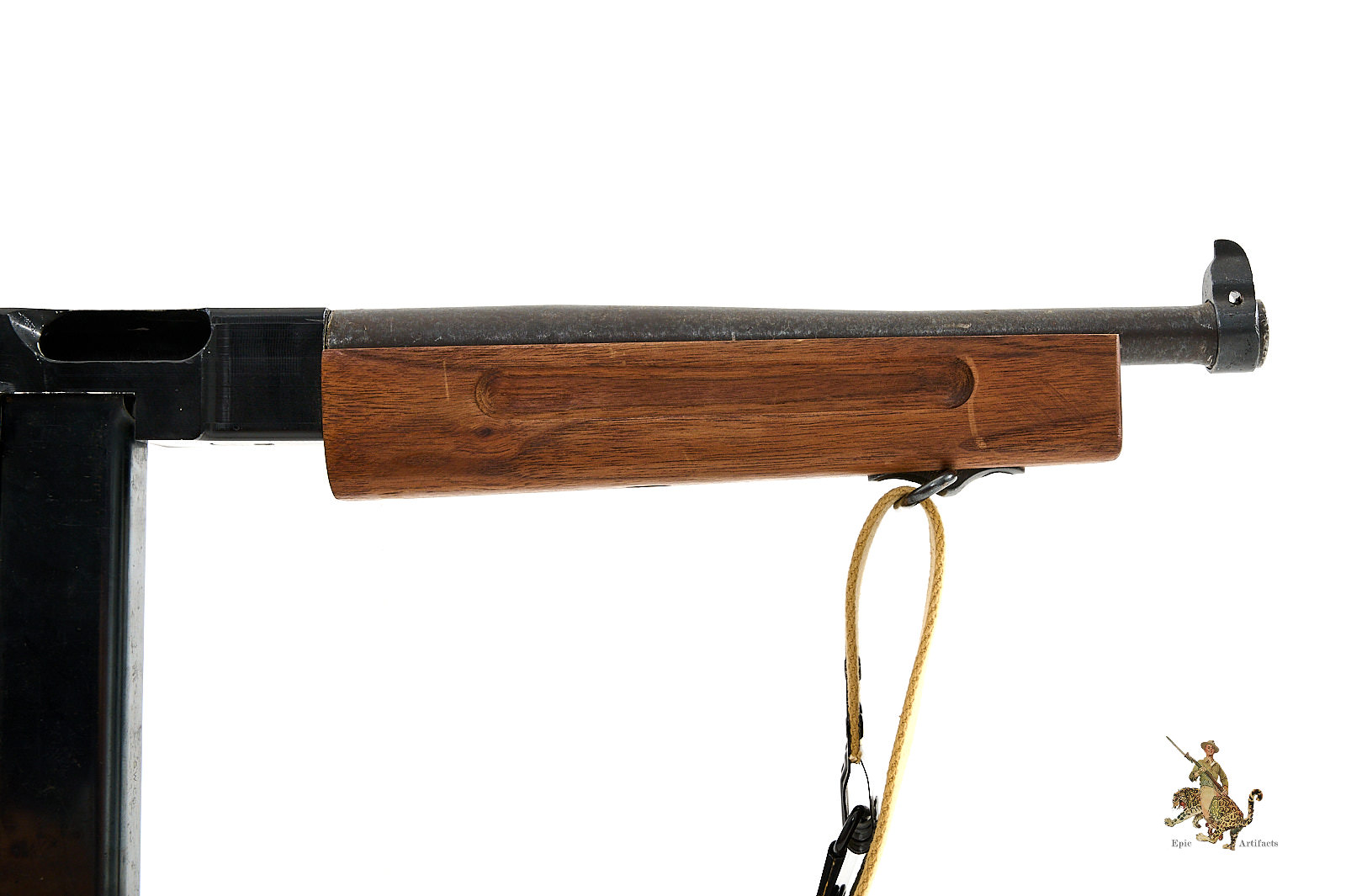 Historical Description: The M1A1 Thompson submachine gun was one of the most iconic American infantry weapons of the Second World War and a symbol of U.S. firepower during the conflict. Introduced in 1942 as a simplified and more economical successor to the earlier M1928 models, the M1A1 was chambered in .45 ACP and designed specifically for rapid wartime production. It eliminated complex machining features such as the Blish lock and Cutts compensator, resulting in a robust, straight-blowback weapon that was easier to manufacture while retaining the Thompson’s famed stopping power and reliability.