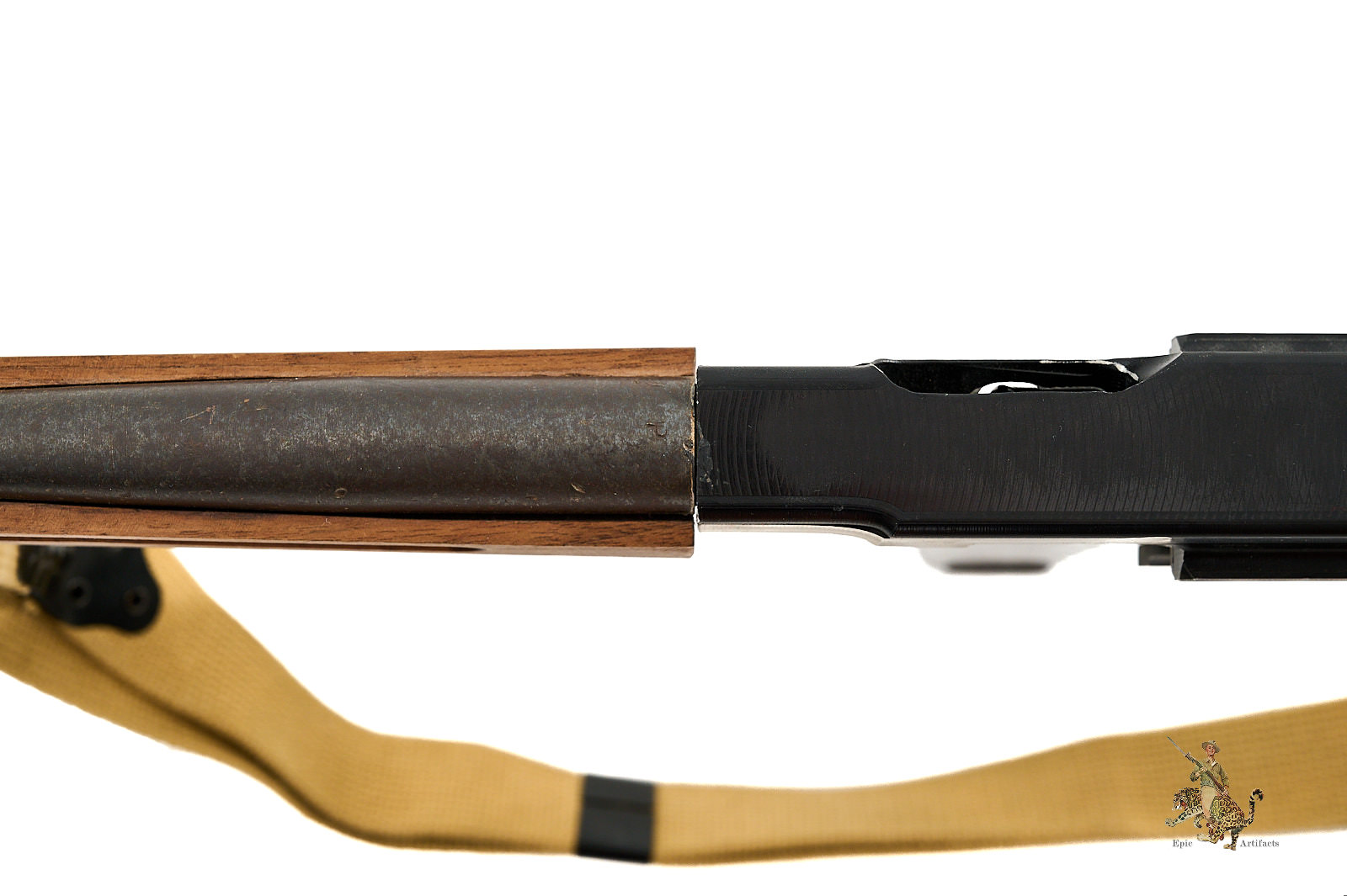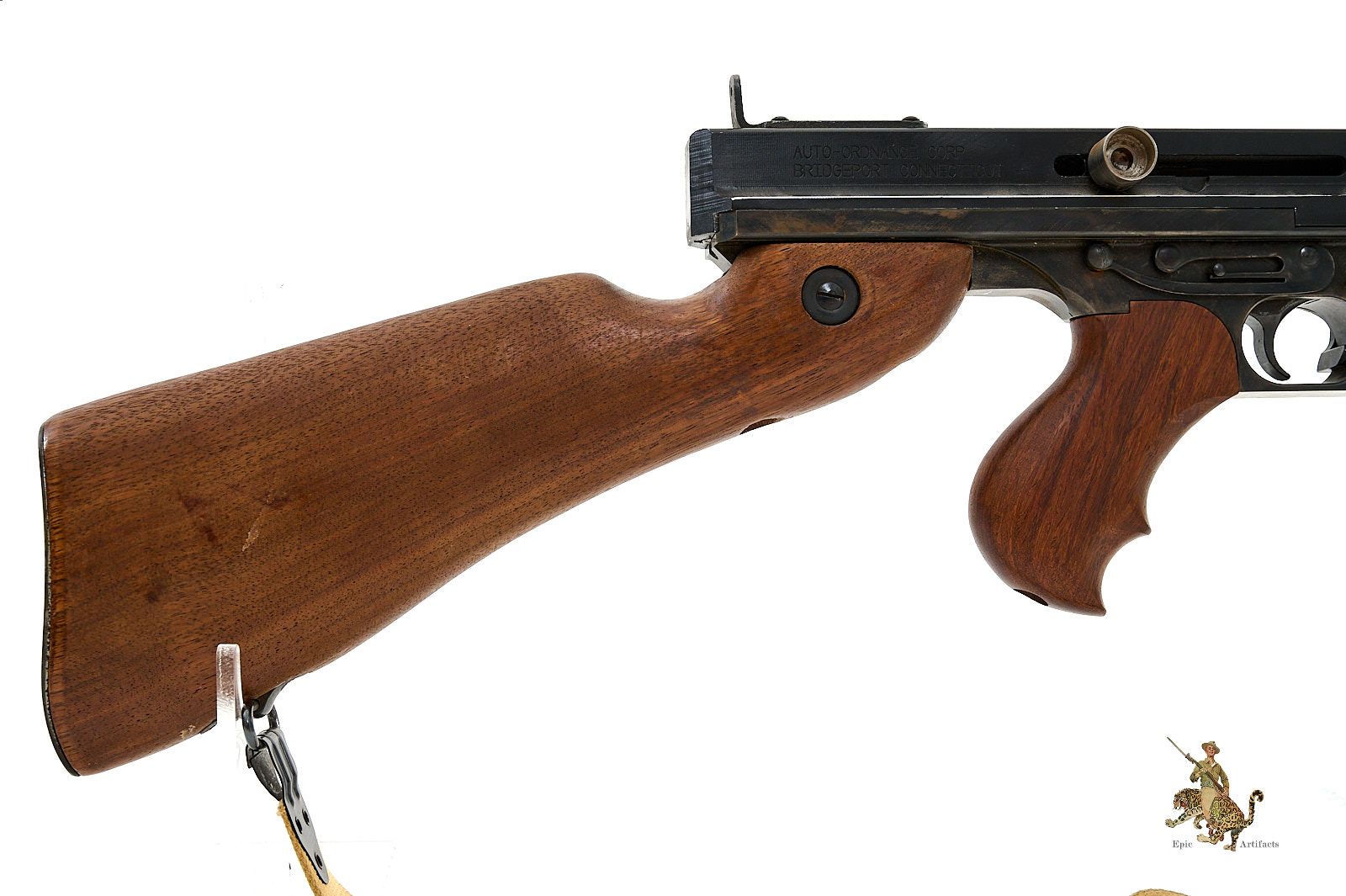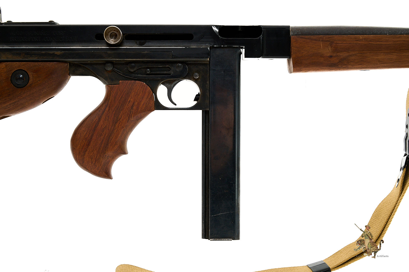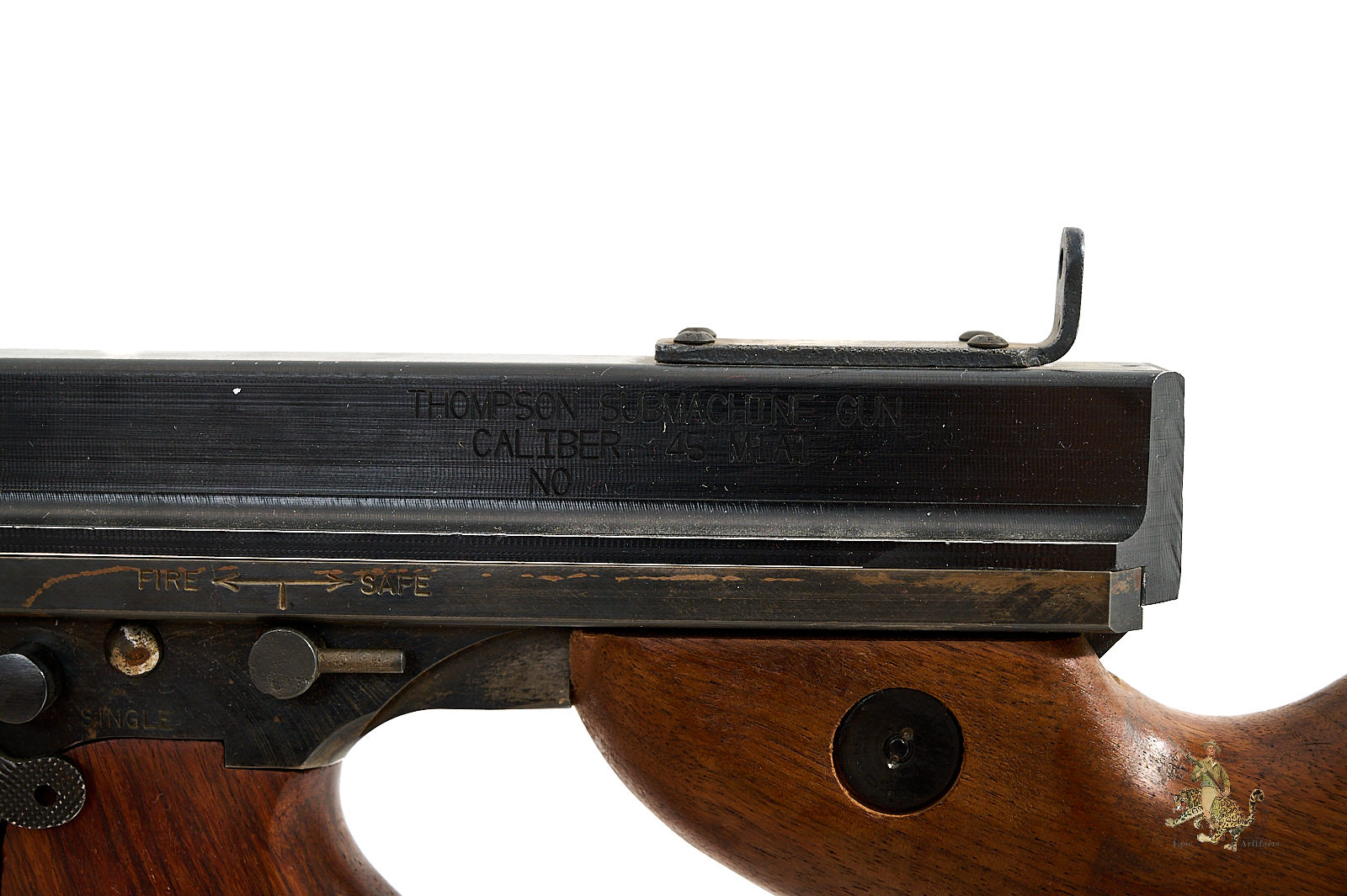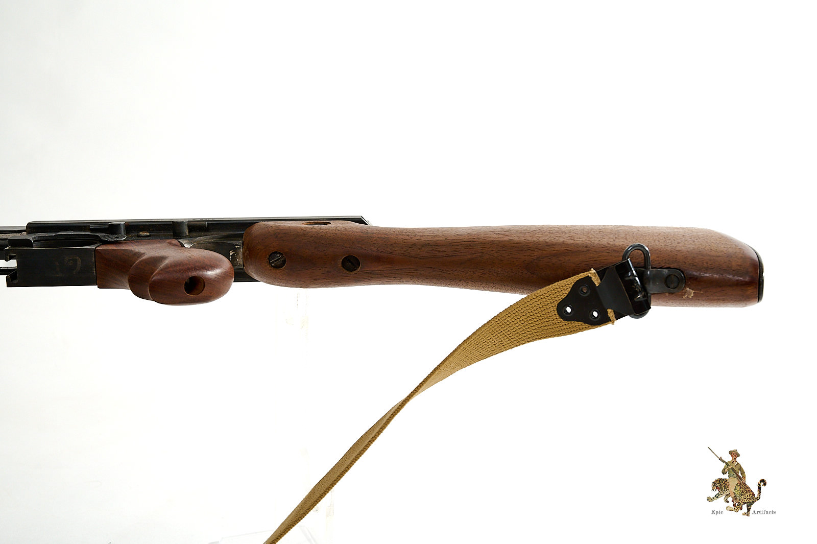 Historical Description: The M1A1 Thompson submachine gun was one of the most iconic American infantry weapons of the Second World War and a symbol of U.S. firepower during the conflict. Introduced in 1942 as a simplified and more economical successor to the earlier M1928 models, the M1A1 was chambered in .45 ACP and designed specifically for rapid wartime production. It eliminated complex machining features such as the Blish lock and Cutts compensator, resulting in a robust, straight-blowback weapon that was easier to manufacture while retaining the Thompson’s famed stopping power and reliability.