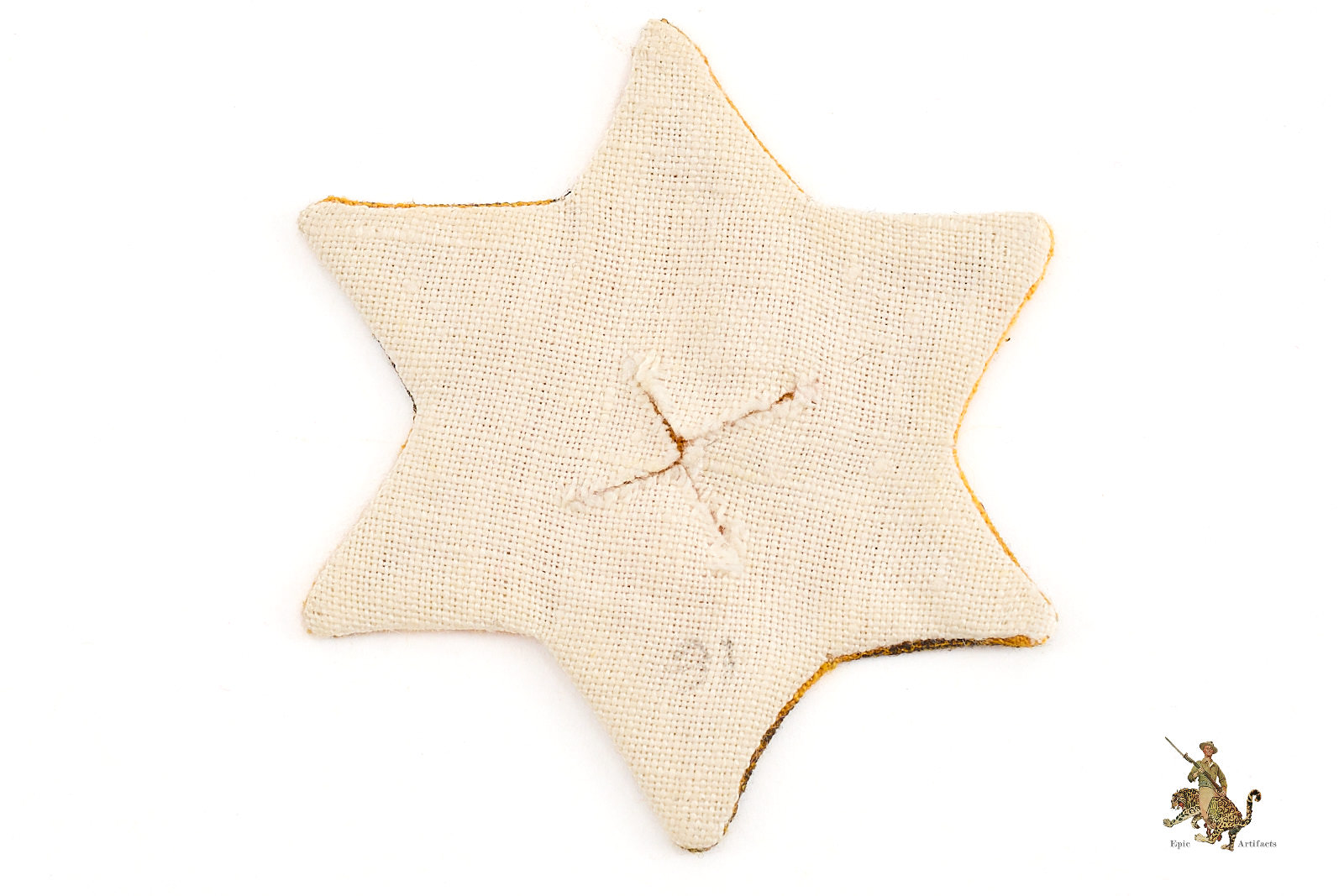 Historical Description: The Yellow Cloth Star of David was a forced identification badge imposed by the Third Reich and its collaborators during World War II as part of their persecution of Jewish populations. Beginning in September 1941, Jews in Germany and occupied territories were legally required to wear the yellow star, which featured the word “Jude” (German for Jew) printed in black Gothic-style lettering. The badge was designed to be highly visible, intended to stigmatize, isolate, and dehumanize Jewish individuals, marking them for discrimination, deportation, and ultimately, extermination.