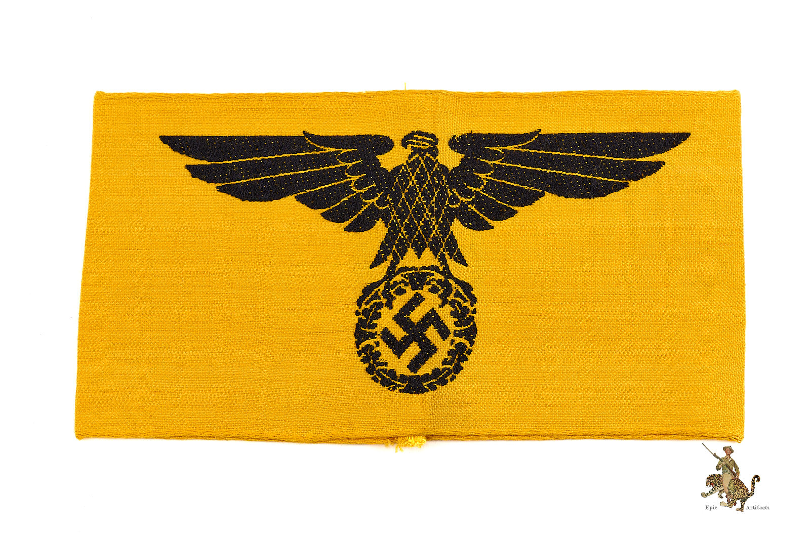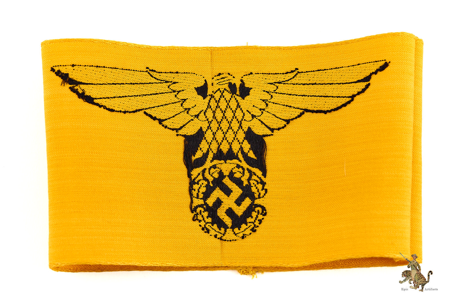 Historical Description: Nearly every military, civil, political, and paramilitary organization in existence during the Third Reich used armbands. Armbands were worn on military and civilian uniforms and also on civilian clothes, from suit jackets to work clothing. They were used to denote membership in organizations, to indicate a specific role or function of the bearer, and as insignia of rank. Many organizations would change the design of their armbands over time, which added to the variety produced. These were manufactured in countless variations, ranging from simple printed bands to elaborately hand-embroidered pieces of the highest quality. Some Nazi armbands were worn by all members of large organizations and were made by the millions. Others were intended for use at a specific time and place and were unique. Many types were made in very limited numbers. Some bore metal insignia or special identifiers that indicated the wearer’s rank, unit affiliation, or nationality. Armbands were sometimes but not always marked with ink stamps by the issuing authorities.