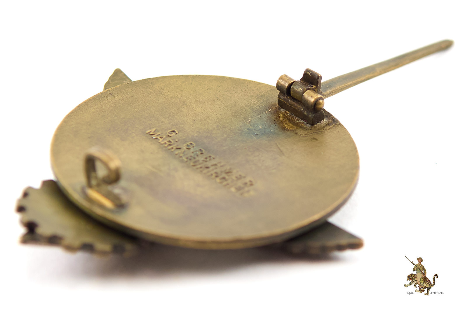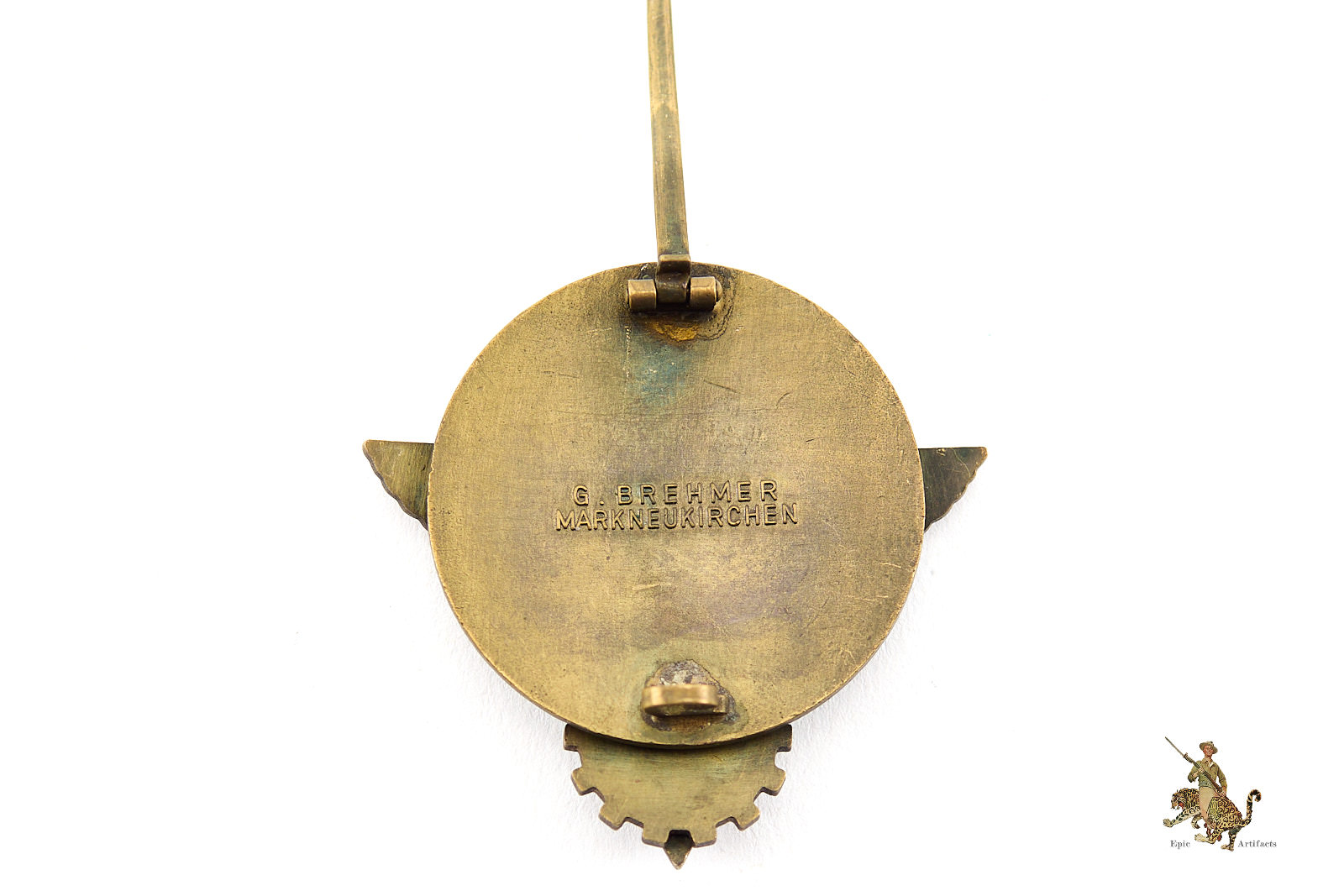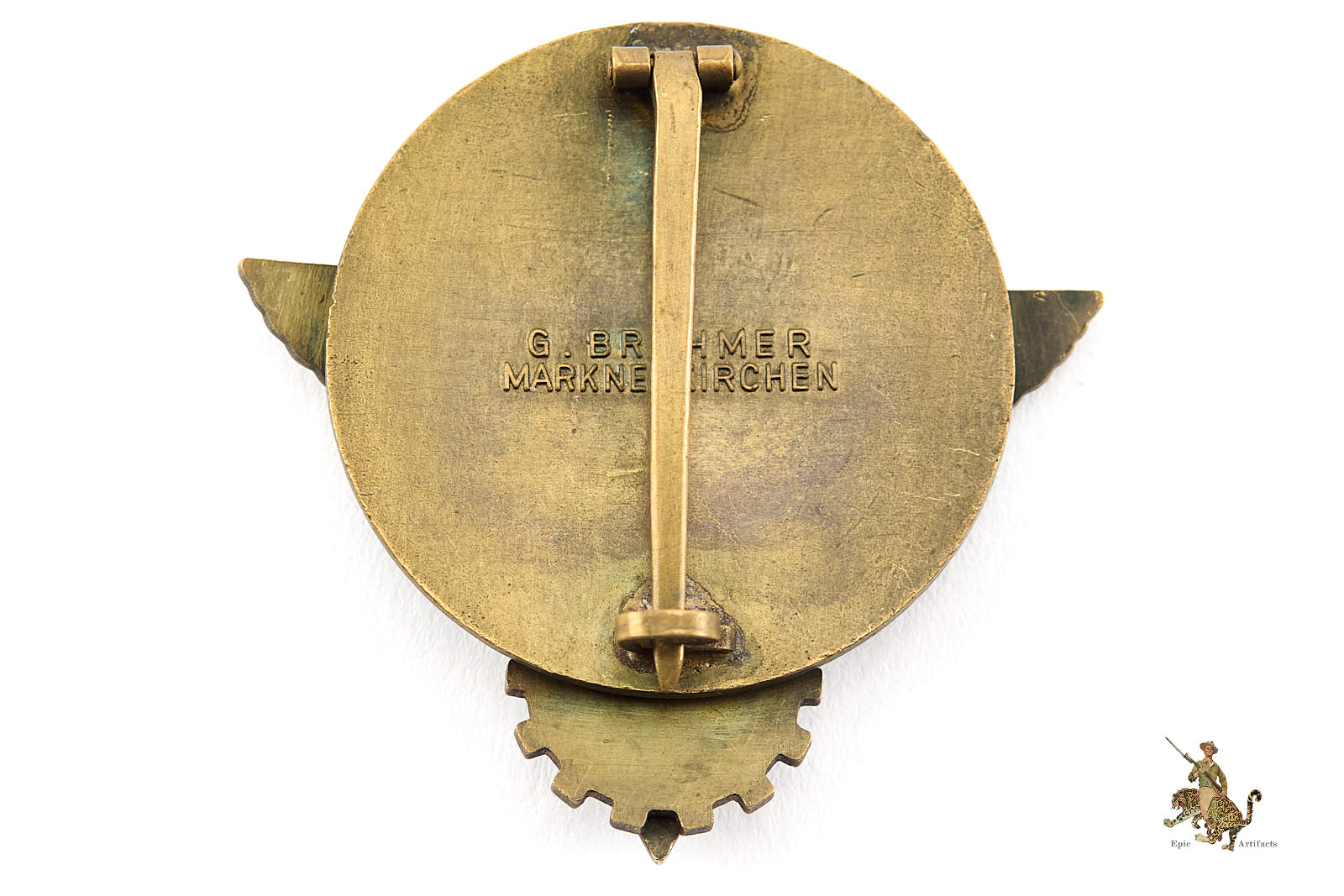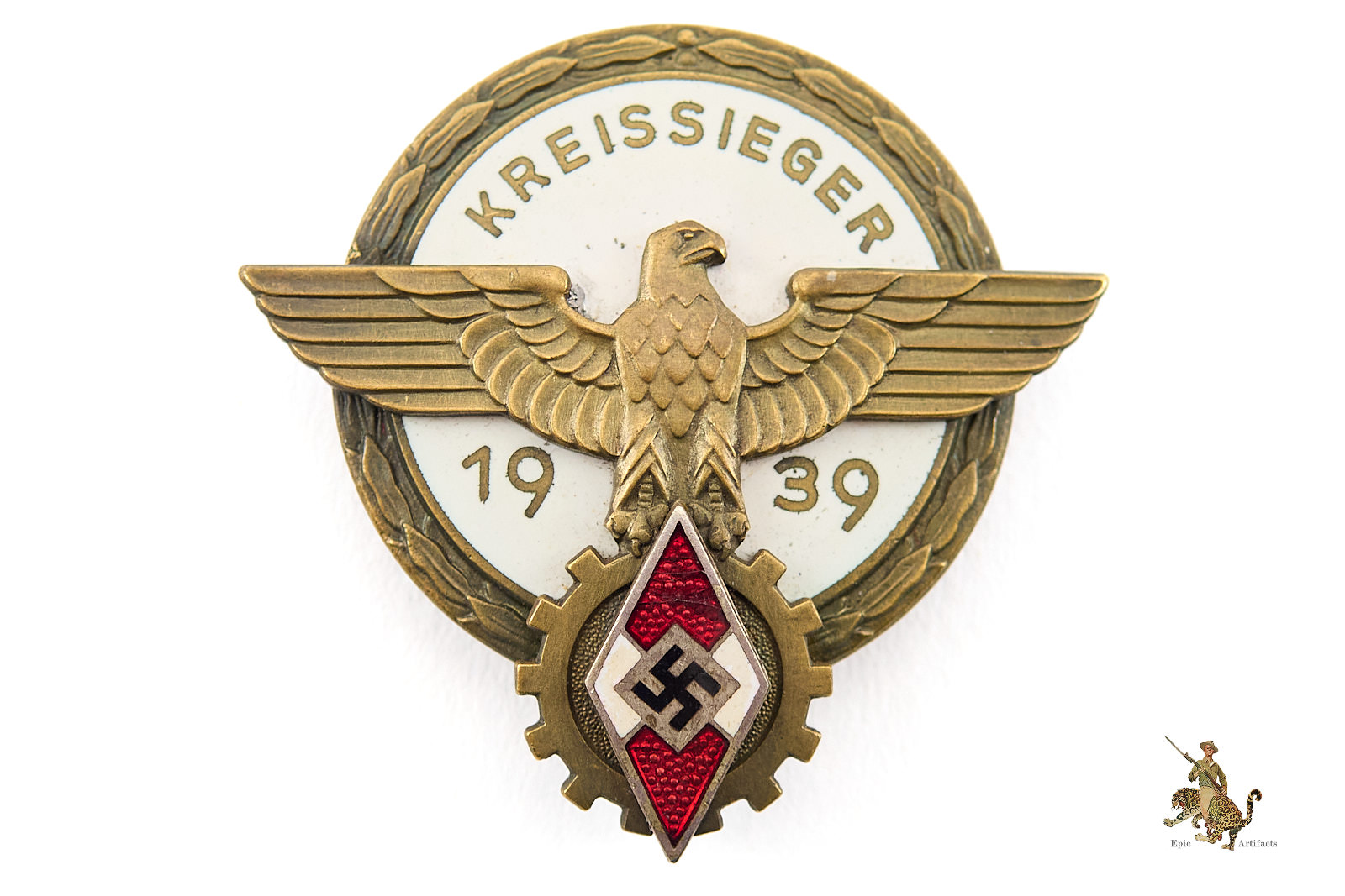 Product Description: This HJ Kreissieger Badge is a desirable piece, with a great look. The date on this one is 1939. The obverse shows only light age, with attractive dark toning to the original bronze finish. There is little to no evident wear to the metal, and the eagle and wreath retain full original detail. There is a minor chip to the enamel if the eagles right shoulder as well as what appears to be a small dab of solder from a possible repair. The reverse of this HJ Kreissieger Badge is nicely maker marked “G. Brehmer, MARKNEUKIRCHEN” The hardware is still perfectly functional, and features a wide pin, and a block hinge and sheet-metal catch still held in place by the original solder. The reverse retains all of the original finish with has a nice, even patina. Overall, this HJ Kreissieger Badge is a good, representative and entirely textbook example. It rates in very good condition.